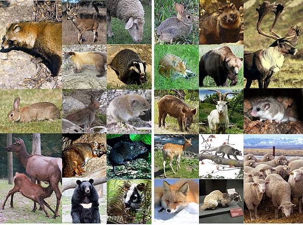 桌子右邊從畫面中間到外側:兔子、狐貍、山豬、鹿、狐貍、貍貓、田鼠、熊、山羊、白鼻心、白鼻心、馴鹿、睡鼠、綿羊