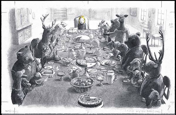 桌子左邊從畫面中間到外側:綿羊、獾、田鼠、田鼠、白鼻心、鹿、貂、兔子、狐貍、熊、貍貓、兔子、鹿