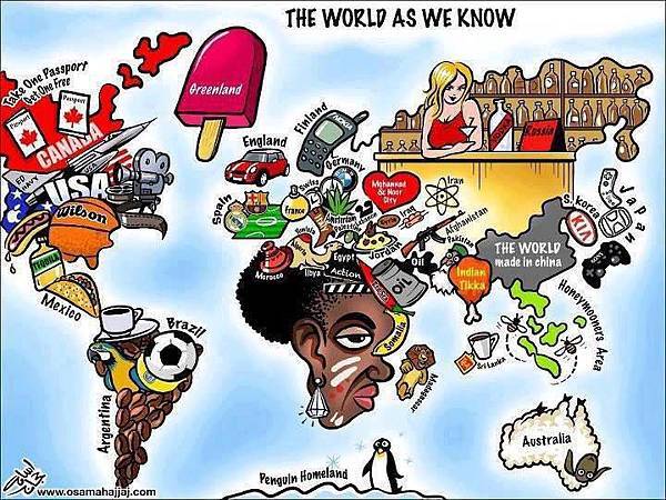 圖中這一幅世界地圖很有趣,充滿了對於地球上各國的聯想與想像。