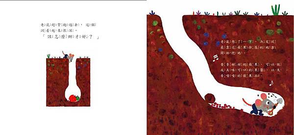 不一會兒,蘋果真的掉下來了,可是蘋果滾呀滾呀,剛好滾進了一個深深的洞裡,小老鼠沒有辦法拿到蘋果,急著想吃到蘋果的小老鼠想了一個好主意,牠要在旁邊挖一個地道,挖到蘋果的位置,就可以吃掉好吃的蘋果了。