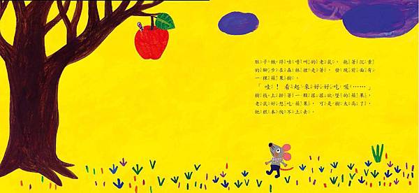 小老鼠肚子餓了,在森林裡到處找吃的,牠拖著沉重的腳步,找著找著,發現眼前有一顆蘋果樹,有一顆蘋果看起來快要掉下來了。