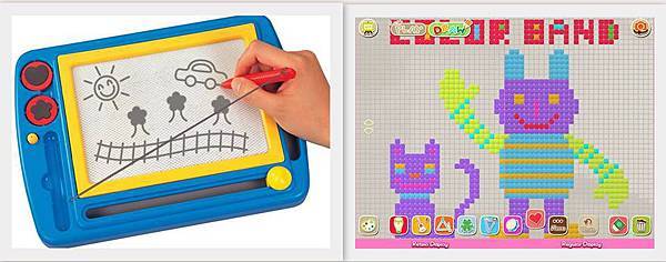 以往,我們為了環保,可能會購置左方這個類似砂畫的畫板玩具給小朋友,但,除非特別用相機拍起,往右一滑,恢復白畫布的同時,作品也一併消失。更遑論說玩具長久的堆疊與轉送,累煞整理人。