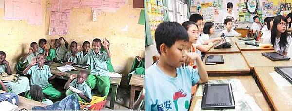 這兩張圖片都是來自教室的場景。圖片的左邊,是東非肯亞孩子們的教室,教室裡好多個同學擠在一張桌子,教室裡面看不到什麼特別的佈告欄、教具或者是任何布置,有的,就是圖片中的幾張桌子跟椅子,大家湊合著跟老師一起學習。同學們覺得這樣的狀況很古怪嗎?其實,在非洲或者是經濟條件較落後的國家,這樣的學習條件,讓他們相對於在村落中有更多的孩子,無法受教育、喝不到乾淨的水,這已經是很令他們滿足、開心的學習環境了;因為,他們至少有機會可以學習,接受教育。