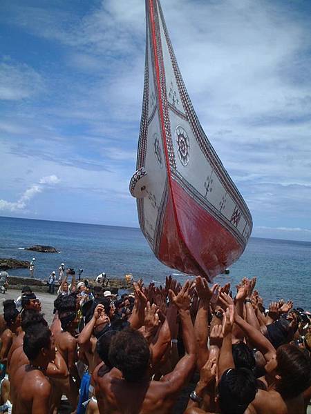 又是一波水氣,溫度倏地降下來。很難想像,酷熱的夏天彼時,在美麗的蘭嶼,碧藍的天空與清澈的海水旁,有這樣的大船下水典禮(又稱大船祭),正風風火火的進行。