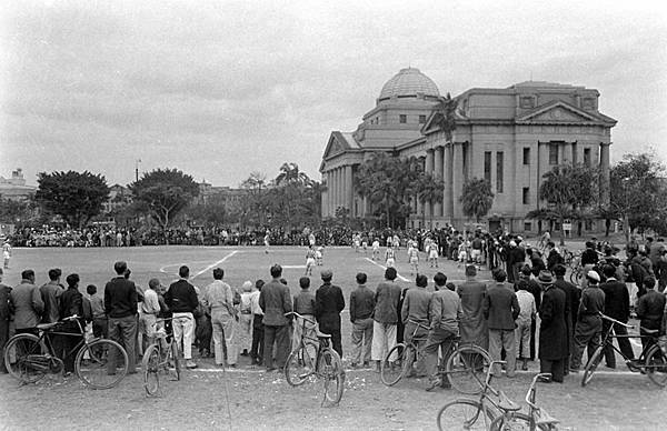 1949年3月,台灣省立博物館旁邊的廣場正在舉行足球比賽。(Jack Birns 攝影)