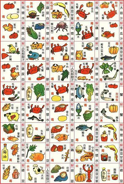 這是早年農民曆背面附上的「食物相剋圖」,提醒我們什麼樣的食物搭配會導致中毒,不過以現代醫學角度來看,這些內容並沒有學理上的依據;我們可以看到在食物相剋圖中,八成以上都是水產類食品,由於古早的時候並沒有冰箱可以保存這類食物,食物容易滋生細菌、發生腐壞,也就容易吃壞肚子,而不是真的中毒。