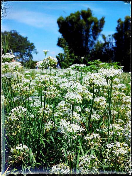 藍天下,雪白的小花開成一片,九月的風帶起宛如初雪的景色,這是韭菜開花的清新之美。