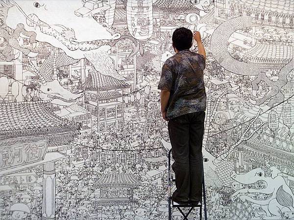 藝術家三宅信太郎運用繪畫、立體、表演藝術等多樣的表現手法呈現他原創的藝術世界。他常用的媒材為彩色鉛筆,因為他認為彩色鉛筆最合手,最能讓他自然地創作。作品包含「扁平」以及「重覆」的元素,通常以橫向無限發展,顯示出豐富的想像力。