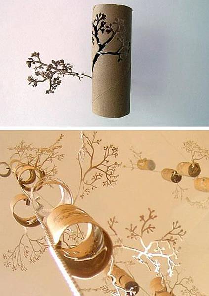 具備創意的眼睛就是可以將無用的廢棄物轉化成為美麗的裝飾品,瞧,透過紙雕藝術的運用,捲紙筒刻出一叢一叢的樹苗。